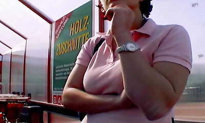 A splendid German babe with massive boobs gets screwed on the stairs