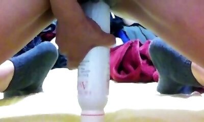 Trampy light-haired teen allows a guy to poke a bottle in her pussy