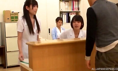 Reverse gangbang with Japanese nurses and the lucky guy