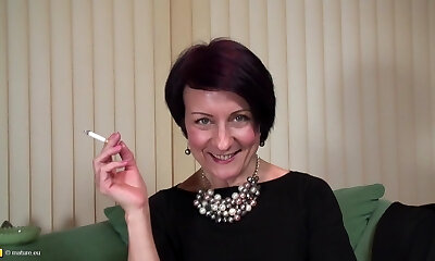 Ravishing mature babe with shaved snatch fondling it in an robust solo shoot