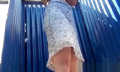 Young neighbor spies on leggy dark skinned MILF fingering herself